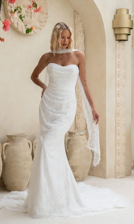 Delicate draping around the waist evokes a touch of softness and serenity. With the addition of a matching lace neck scarf (optional), Esther is a statement of elegance for the bride who embraces subtle sophistication.