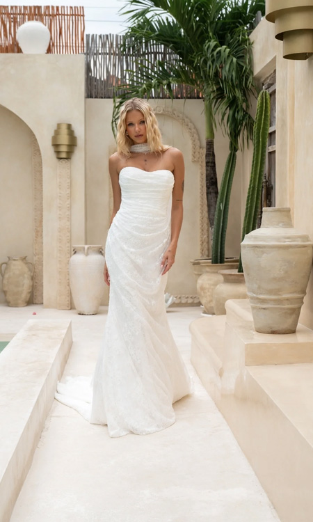Crafted from soft, sleek lace, her straight silhouette glides effortlessly, while the sweetheart strapless neckline adds a touch of classic femininity to this wedding gown.