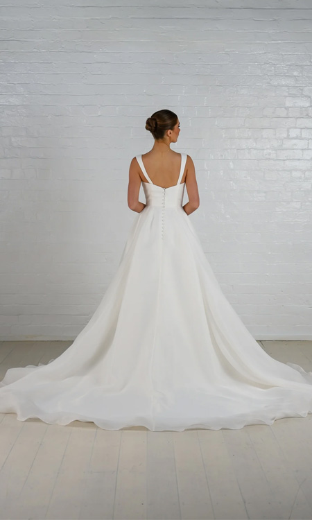 Breathtakingly light and floaty, Chantelle is a dreamy vision in organza. Her A-line skirt cascades effortlessly into a chapel train behind, the picture of demure elegance. The straps add extra support as well as a classy touch to this gorgeous gown.