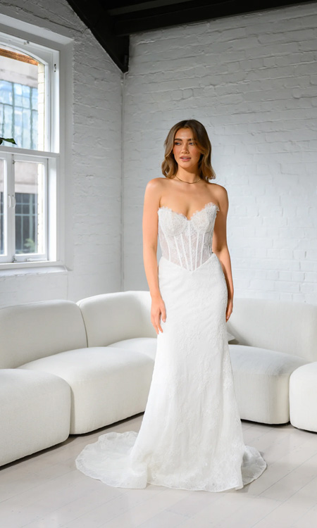 A breathtaking dream covered in Lace. Eden’s corseted Cat-eye bodice is softened with bits of Chantilly lace peeking through, lending a romantic look to this