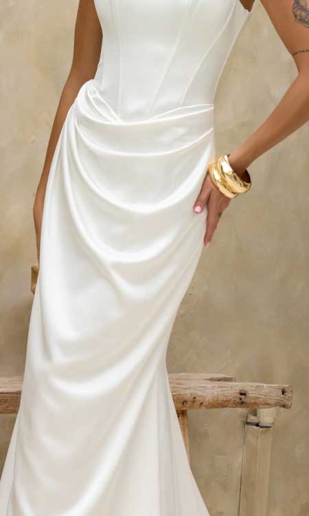 Crafted in luminous Charmeuse, the gown is softly draped around the waist to enhance the silhouette. The corseted bodice offers both support and shape. Timeless and polished, Katara is an effortlessly sophisticated choice for the minimal, stylish bride.