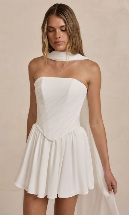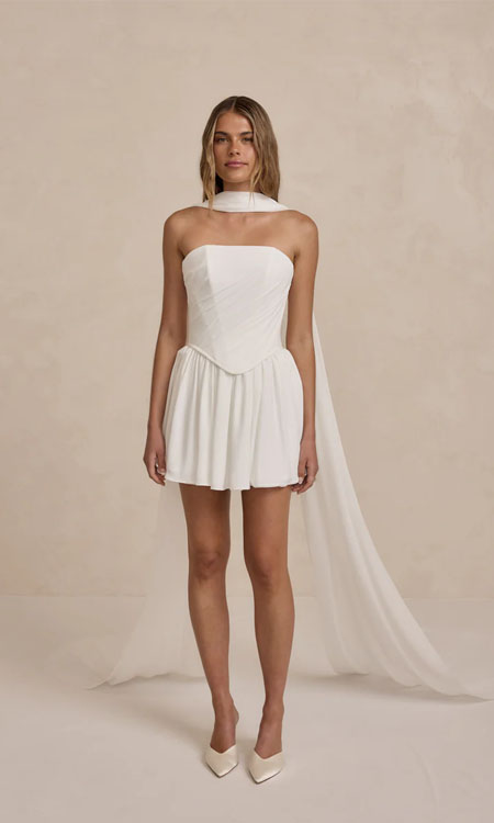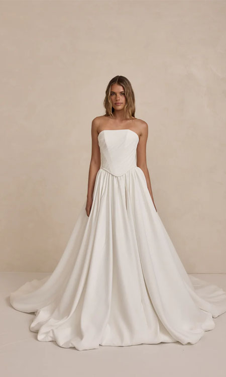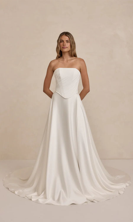 The Leo Bodice is a structured bridal separate, designed with clean lines and soft pleated chiffon detailing. The thick chiffon adds texture and movement, while the sculpted fit offers a modern, polished silhouette.