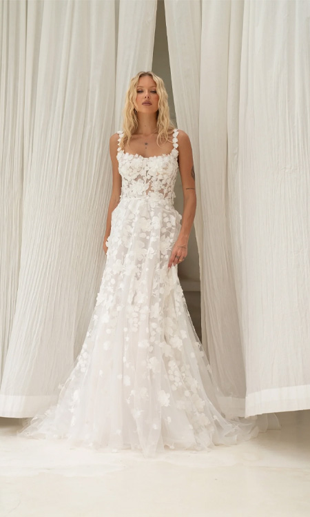 Adorned with dimensional floral lace and finished with delicate straps, framing a Square neckline, this romantic A-line Wedding gown is the perfect match for an outdoor celebration.