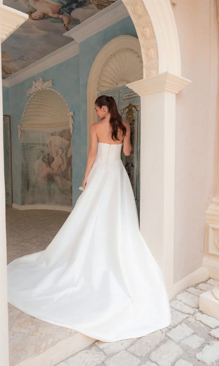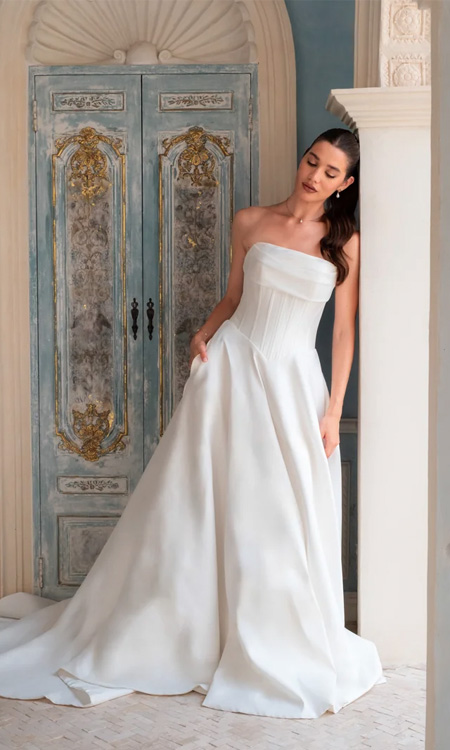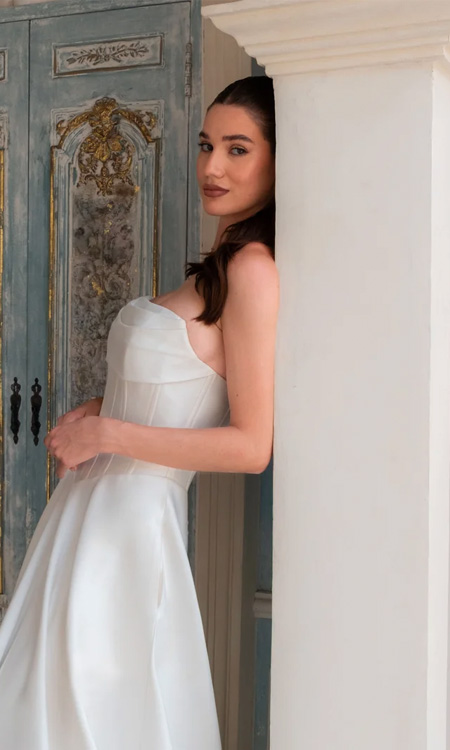 Graceful and refined, Selene is a strapless A-line ballgown that captures the beauty of modern structure and timeless simplicity. Crafted from luxurious soft mikado, the gown features a corset-style bodice with contemporary ruched panels across the bust, complemented by exposed boning that sculpts and supports the silhouette. A flattering basque waistline enhances the natural shape of the waist, creating an elegant, architectural look inspired by the quiet grandeur of European design. At the back, a row of delicate buttons traces the zipper closure, adding a classic bridal detail. The full A- line skirt flows effortlessly from the structured bodice, creating soft volume and movement while discreetly concealing hidden pockets — a modern bride’s must-have. Sophisticated yet effortlessly wearable, Selene is a gown that balances striking structure with graceful simplicity.