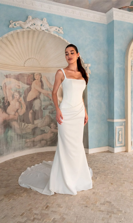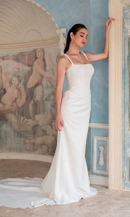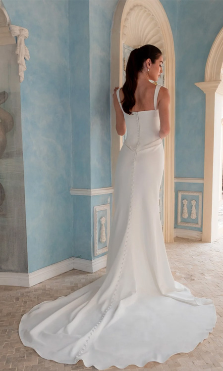 Sleek, refined, and effortlessly modern, Sloane is a sculpted fit-and-flare gown designed to celebrate clean lines and timeless sophistication. Crafted from buttery soft, luxurious crepe, the gown offers both comfort and structure, beautifully contouring the body while maintaining an elegant, fluid feel. The structured bodice features a refined square neckline framed by delicate straps, providing flattering support that extends into a softly defined basque waistline. Subtle ruching at the front hips adds a touch of texture and gentle shaping, enhancing the natural curves before the silhouette flows into a graceful fit-and-flare skirt. At the back, a row of delicate buttons begins at the zipper and continues all the way to the end of the train, creating a classic bridal finish that feels both polished and romantic. Minimal yet striking, Sloane is the perfect gown for the bride who appreciates understated beauty and modern elegance.