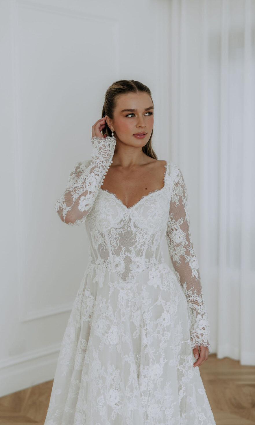 The Willa gown is a vision of feminine grace and quiet divinity. Designed with a soft sweetheart neckline and optional fitted lace sleeves, it flatters with a romantic Basque waistline that melts seamlessly into an elegant A-line skirt. Adorned with delicate floral lace, Willa is a gown that feels both timeless and effortlessly enchanting.